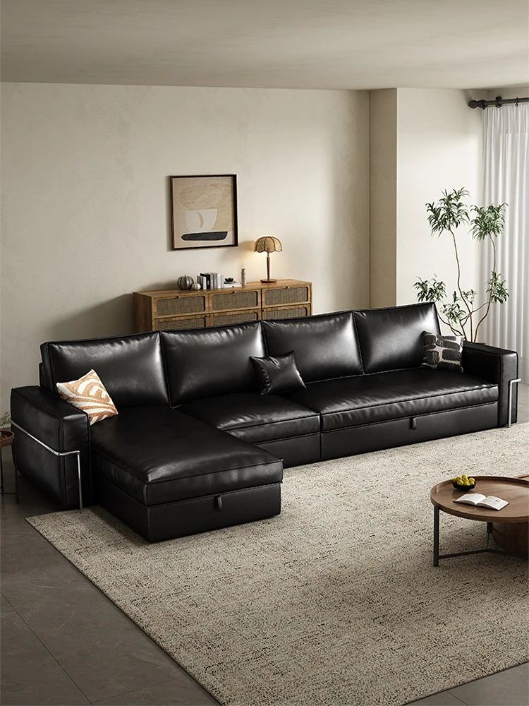 2025 New Arrival Modern Minimalist Black Genuine Leather Sofa for Small Living Rooms - Italian Light Luxury 3-Seater Couch