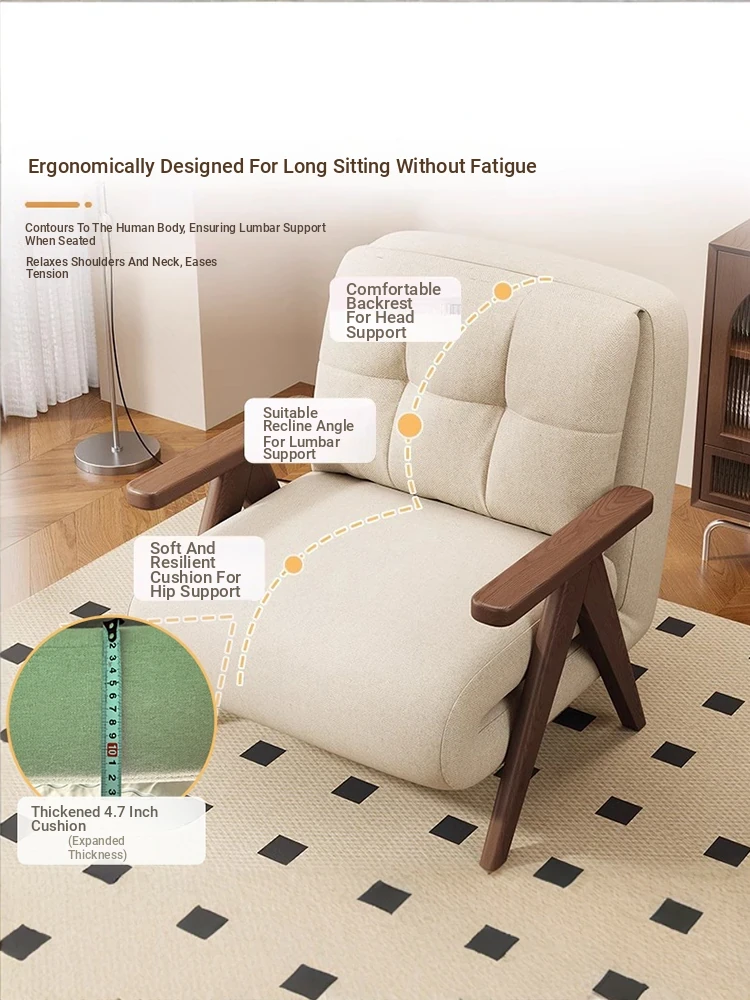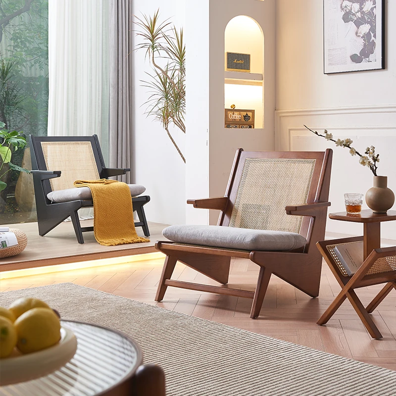 Nordic Solid Wood Single Leisure Chair - Wabi-Sabi Style Designer Sofa Chair for Living Room, Ideal for Guesthouses and Balconies, Featuring Rattan Armrests and Reclining Design