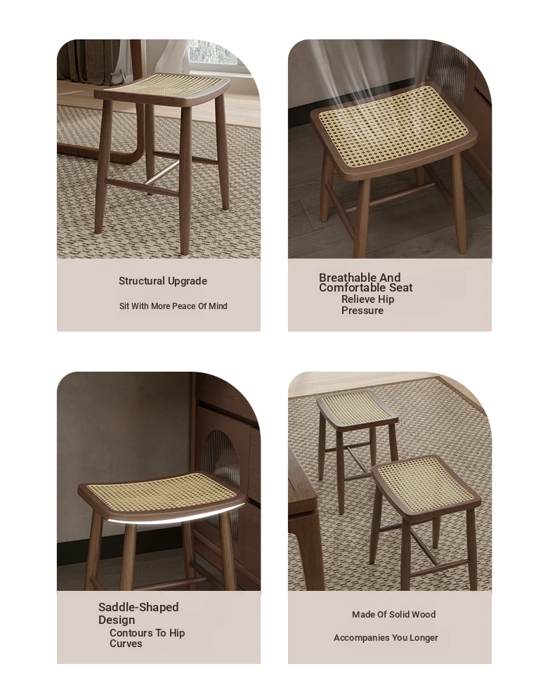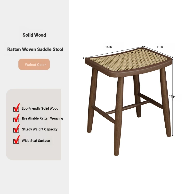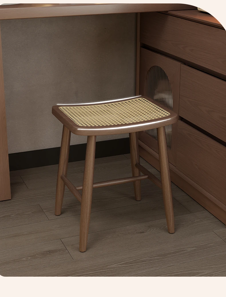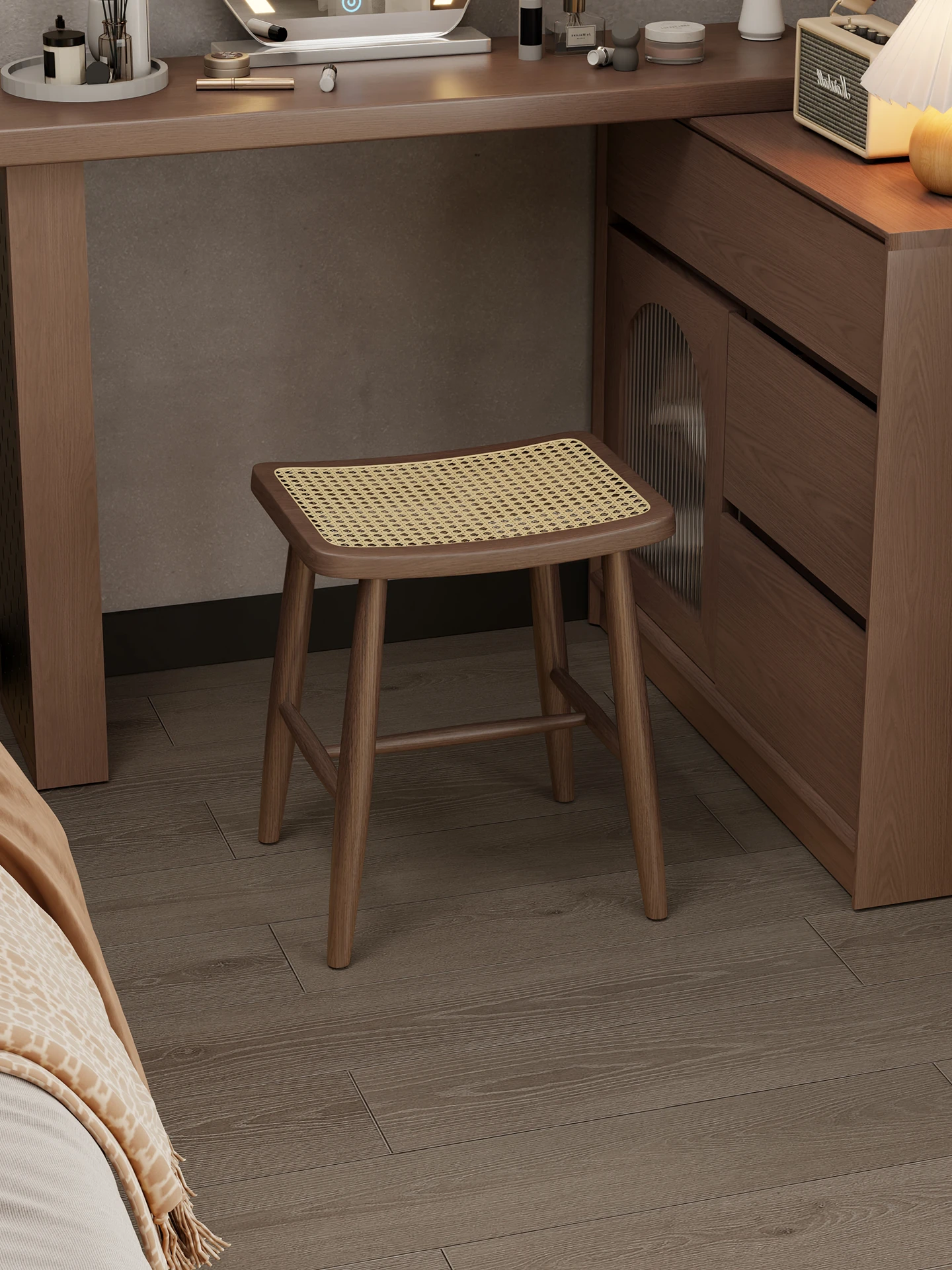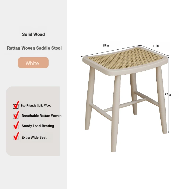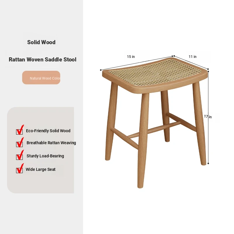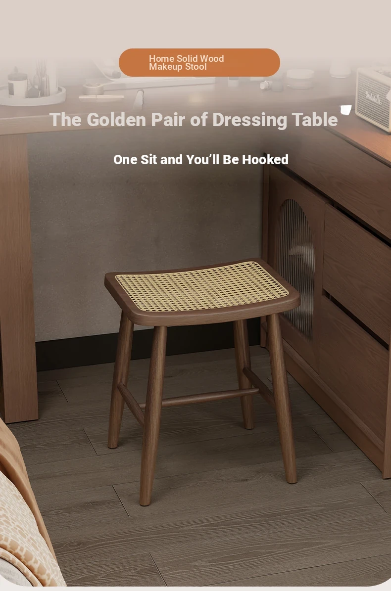 Seasonal Wooden Language Solid Wood Makeup Stool - Minimalist Saddle Stool for Bedroom, Handwoven Rattan Bench, Square Vanity Stool for Dressing Table