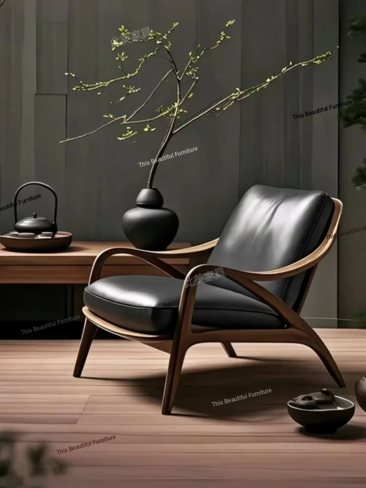 Premium North American Black Walnut Solid Wood Sofa Chair with Genuine Leather – Elegant Single Armchair for Luxury Villas, Living Rooms, Hotels, and Clubs