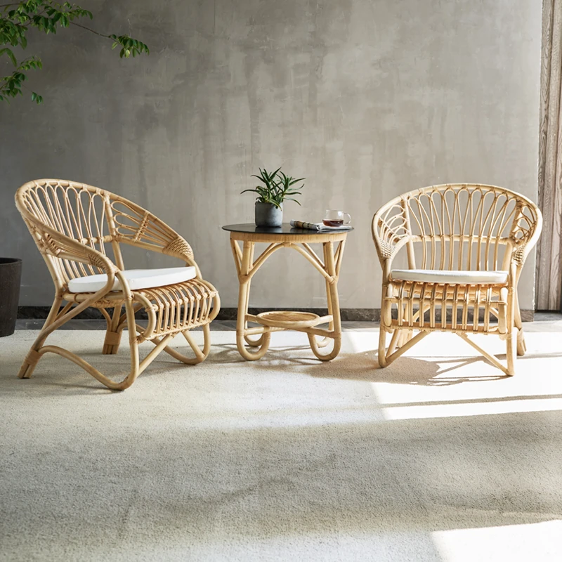 Natural Rattan Three-Piece Chair Set - Nordic Style Balcony Recliner, Perfect for Home and Elderly Use, Bamboo and Rattan Dining Chairs for Cozy Getaways.