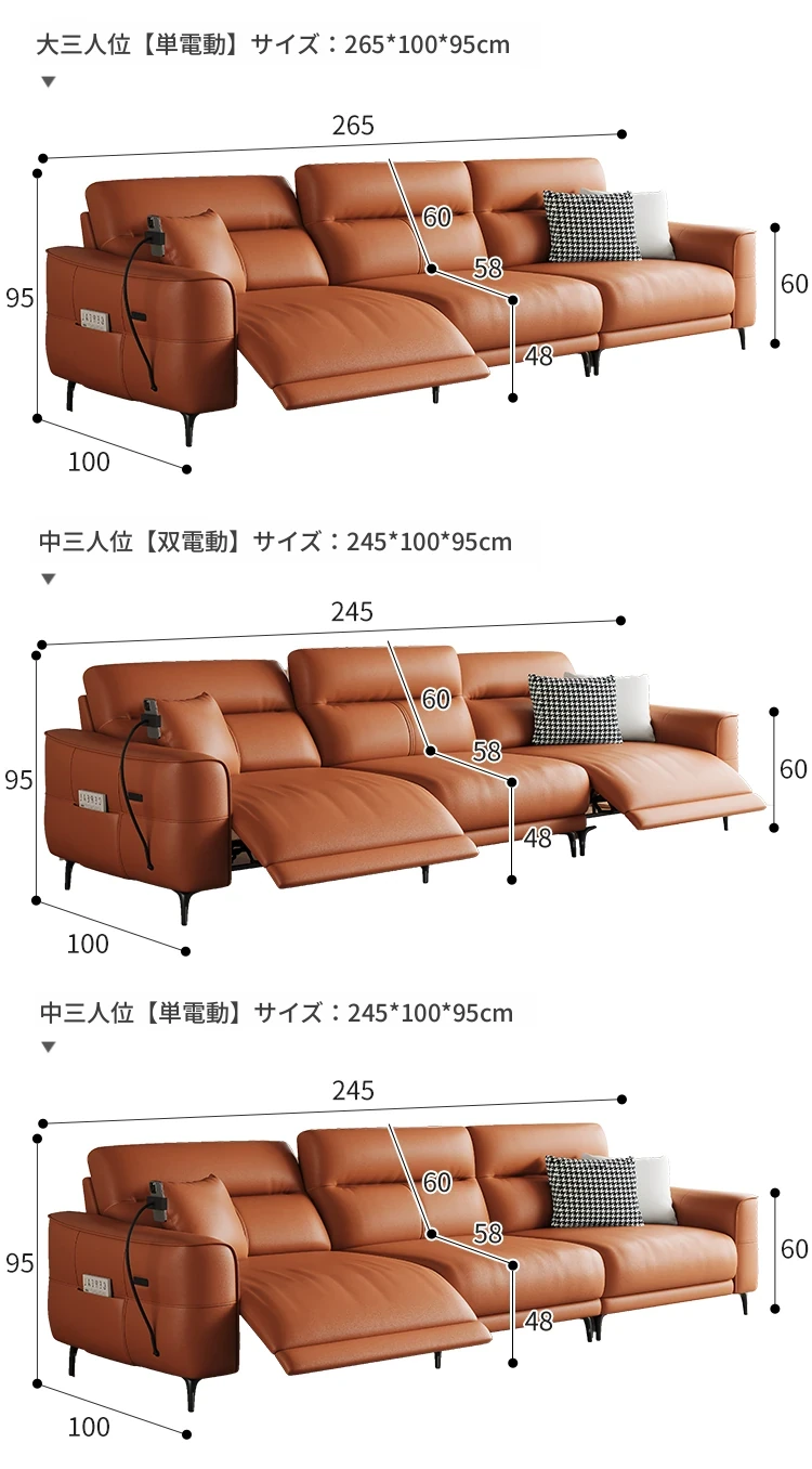2.65m-ダブル電動-大三人席 【接触面輸入加厚トップグレード小黄牛皮】
