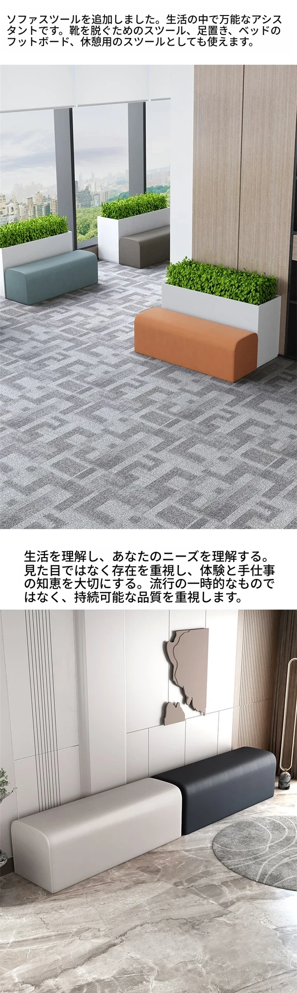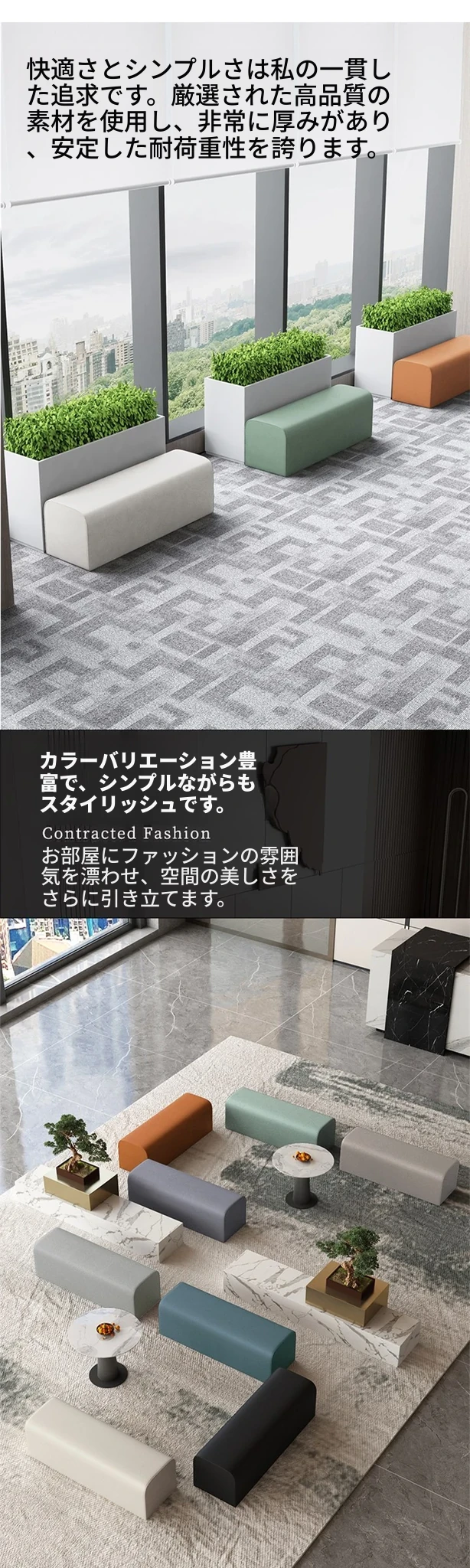 ダンススタジオ用ロングベンチ!休憩スペースや会社のロビー、接客エリアに最適なソファー・カウンターシート。おしゃれで快適なデザインで、服装店にもぴったり!お客様をもてなす素敵な空間を演出します。
