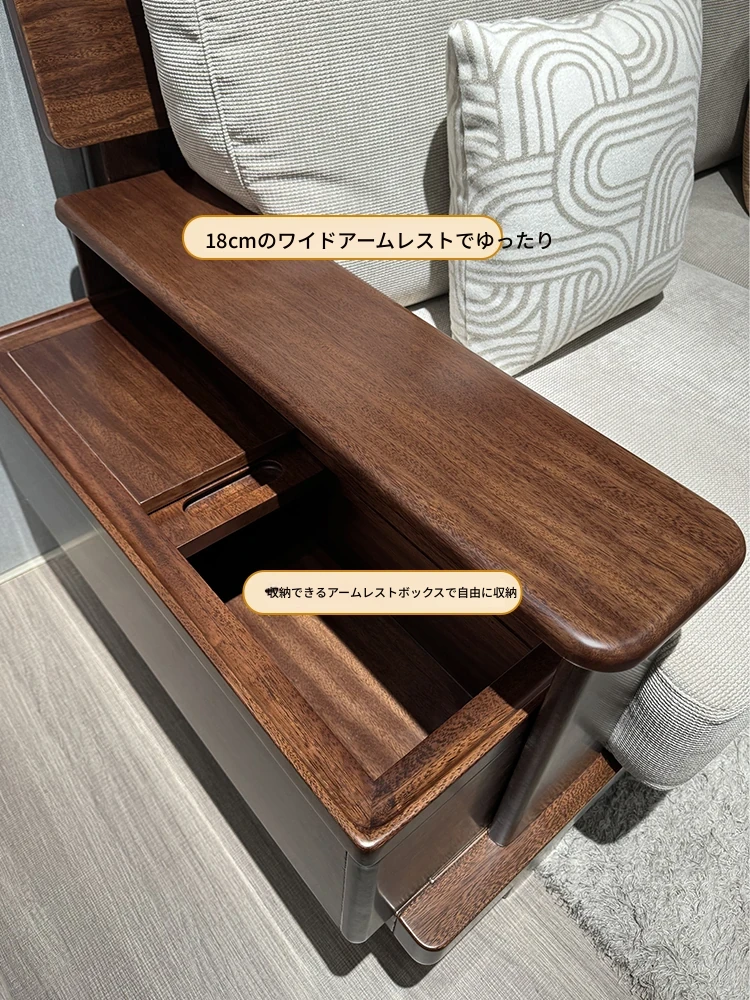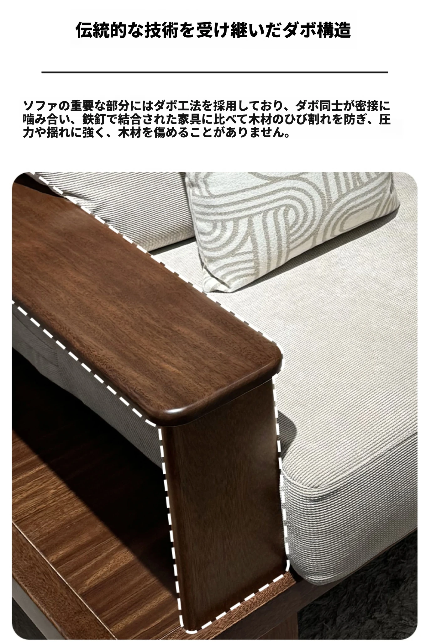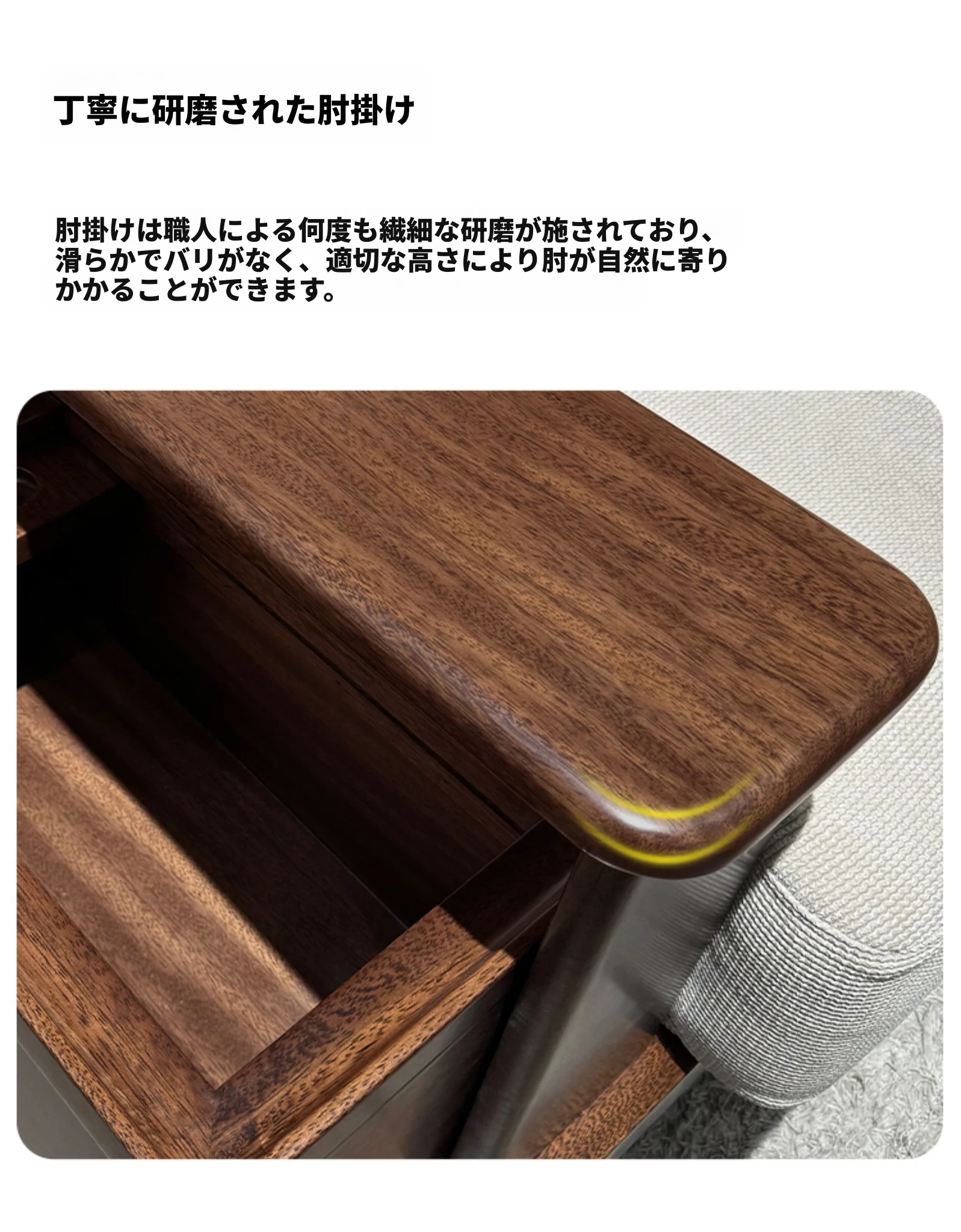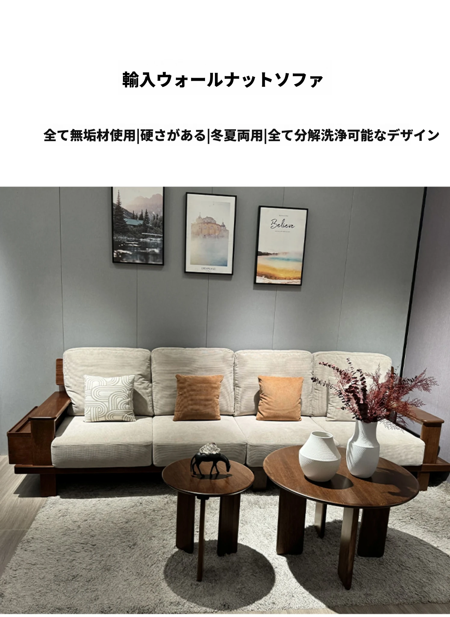 全実木製ソファ|シンプルでモダンなデザイン|小型住宅に最適なウォールナット材|収納付きの4人掛けソファ|快適なリビング空間を演出!