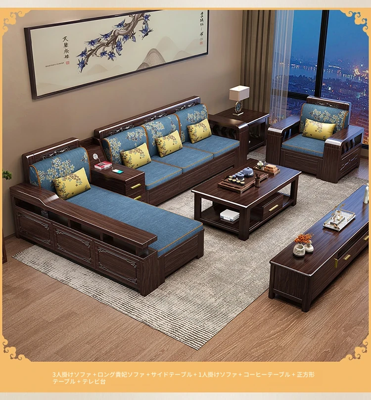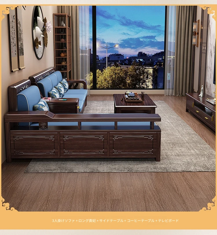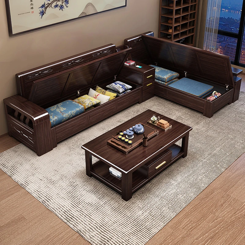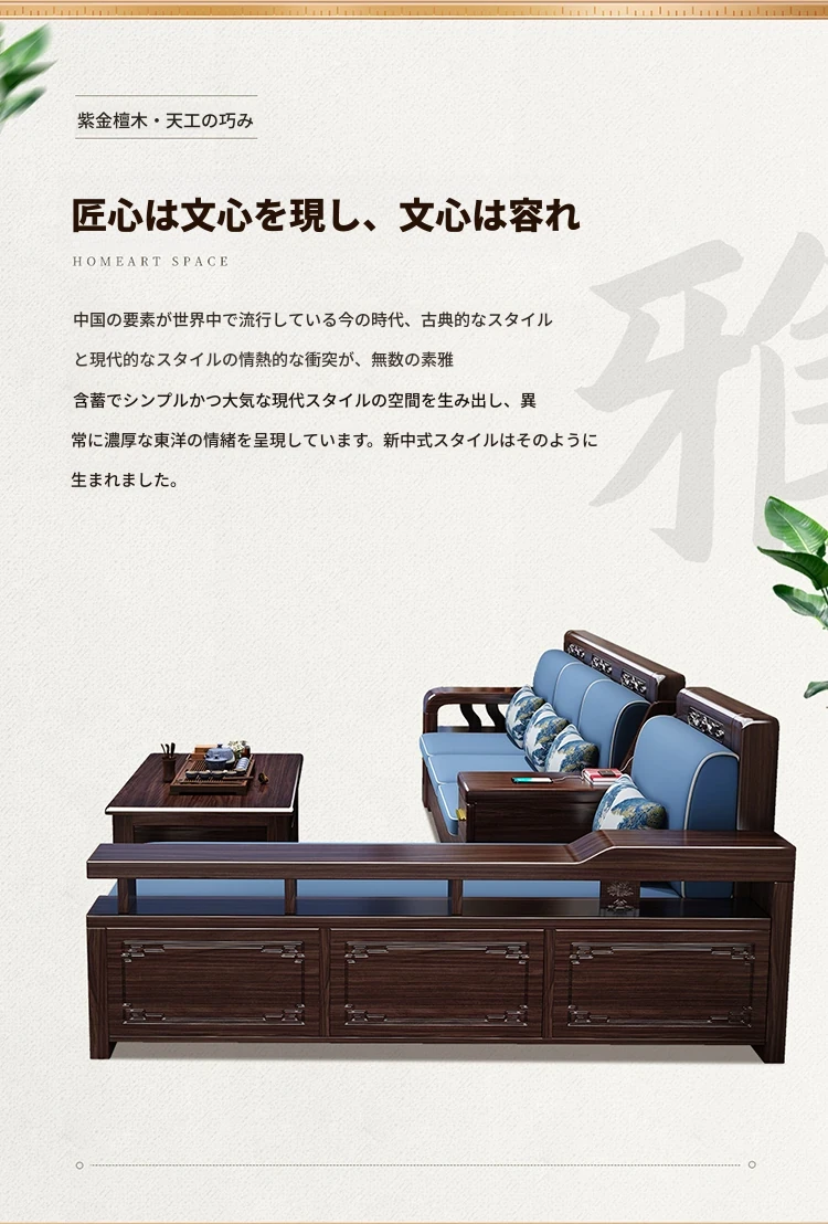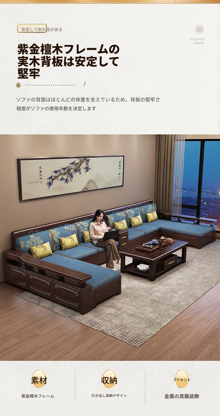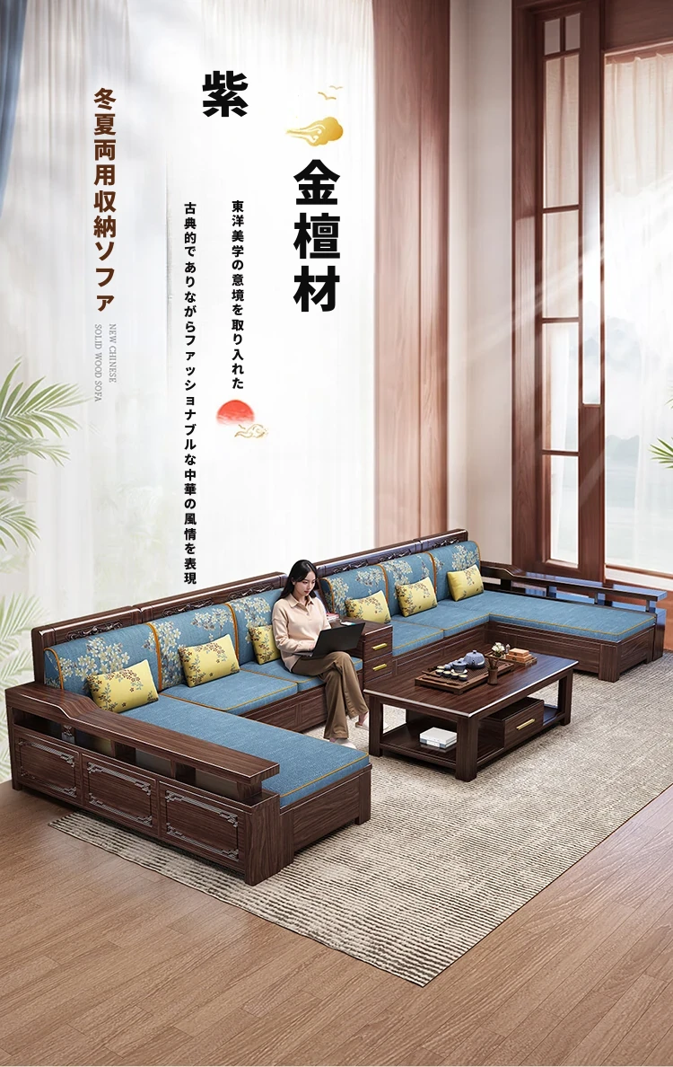 紫金檀木製のモダン新中式リビング用ソファセット - 美しいデザインと実用性を兼ね備えた全木製収納ソファで、快適な居住空間を演出します!