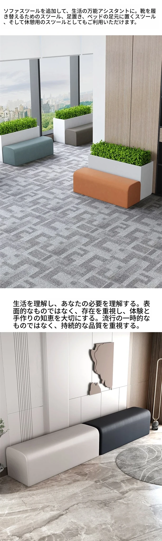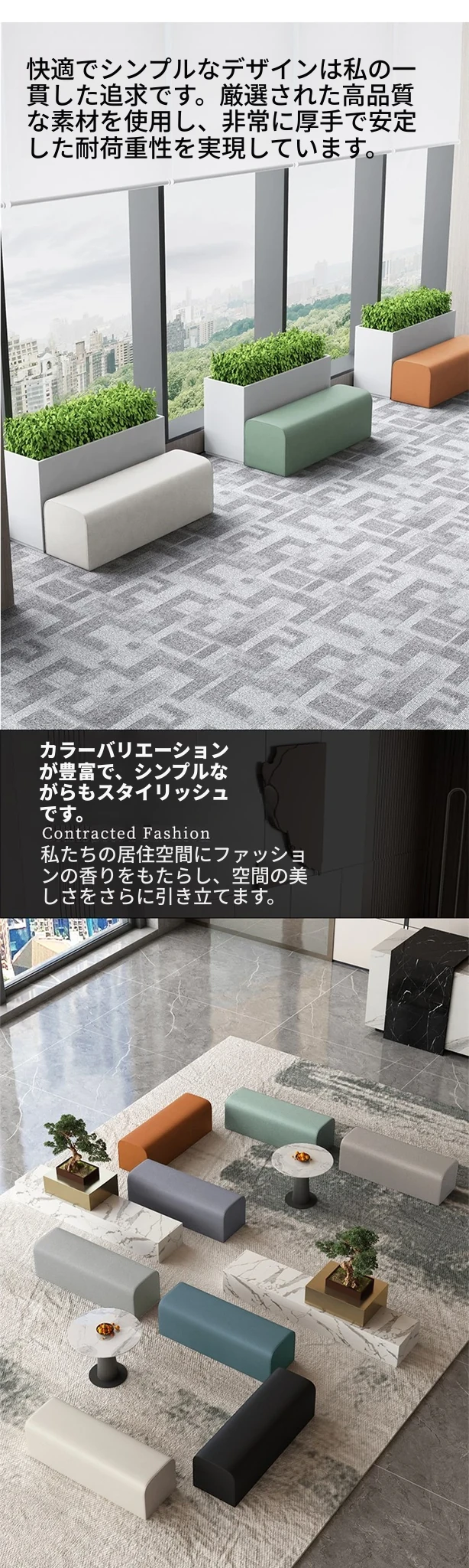 ダンススタジオや企業の待機スペースに最適!おしゃれで快適な長椅子、リラックス空間を演出するソファベンチ。受付エリアや服飾店にもぴったりのデザイン!お客様を心地よくお迎えします。