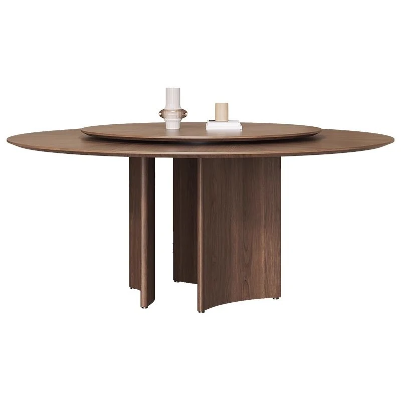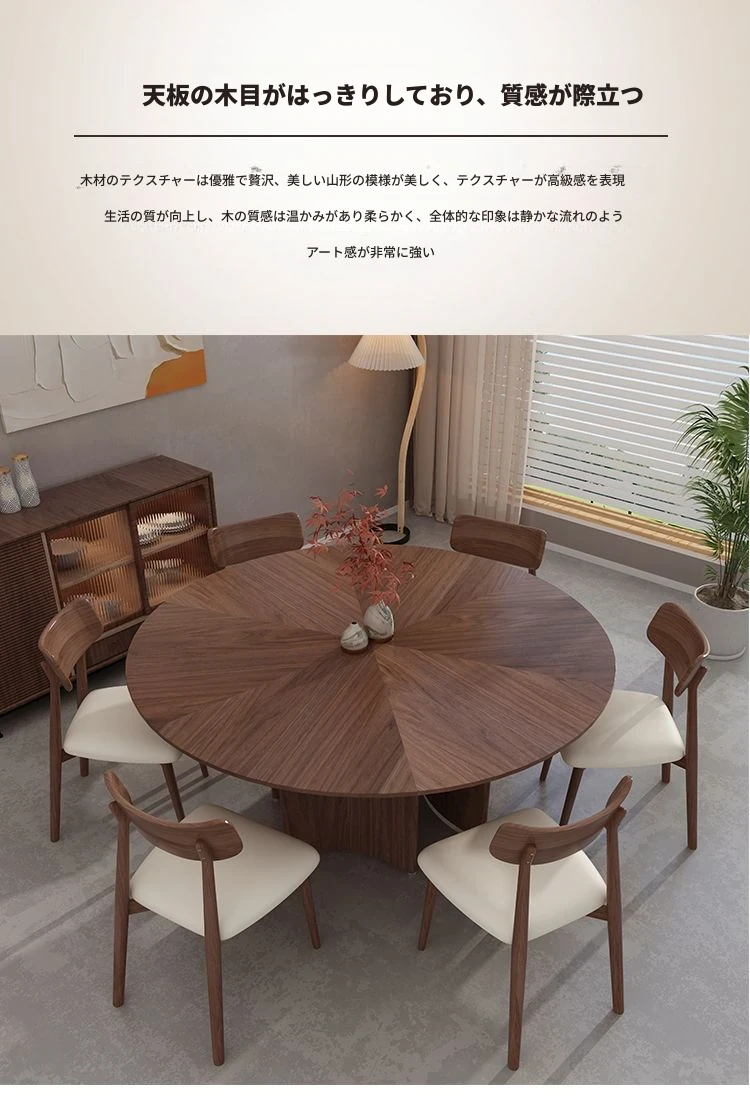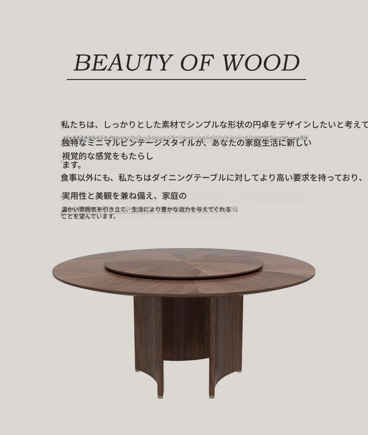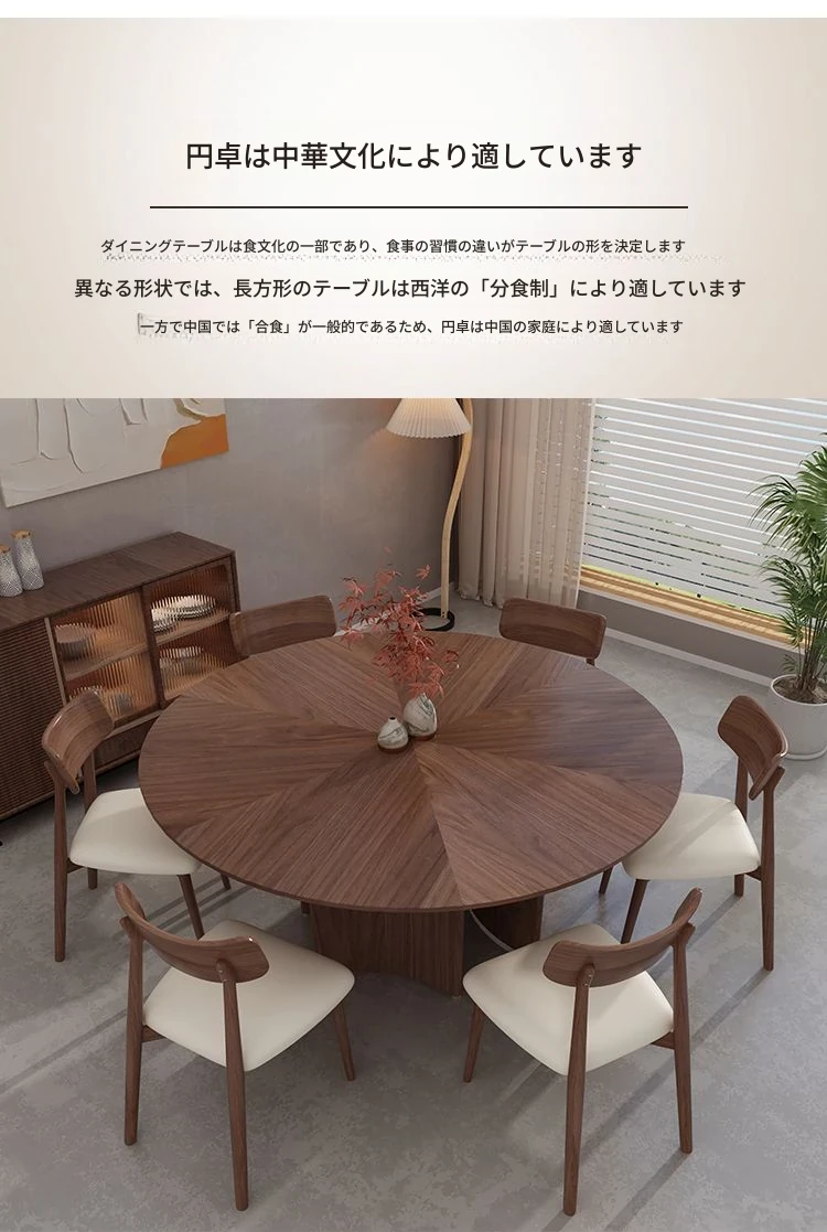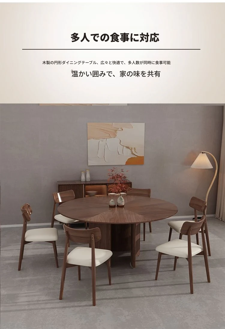 レトロな無垢材の円形ダイニングテーブルセット - コンパクトな家族向け、回転プレート付きのブラックウォールナット円卓。食卓を華やかに彩り、家族や友人との楽しいひとときを演出します!